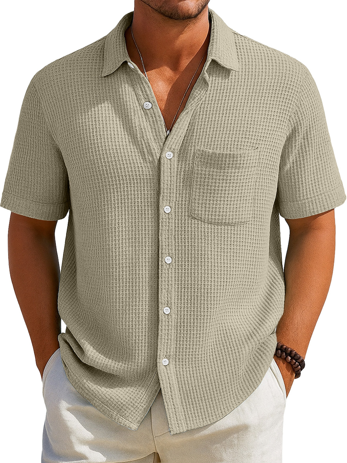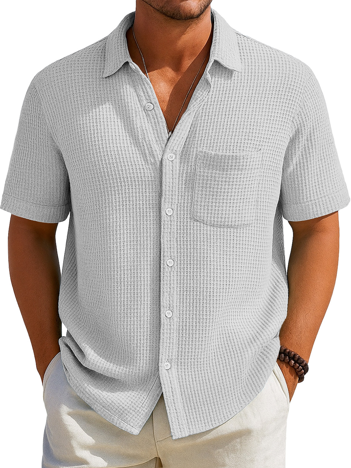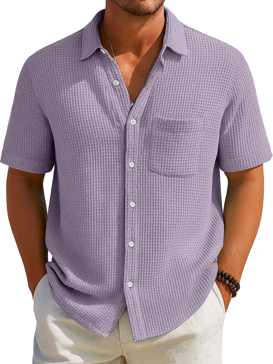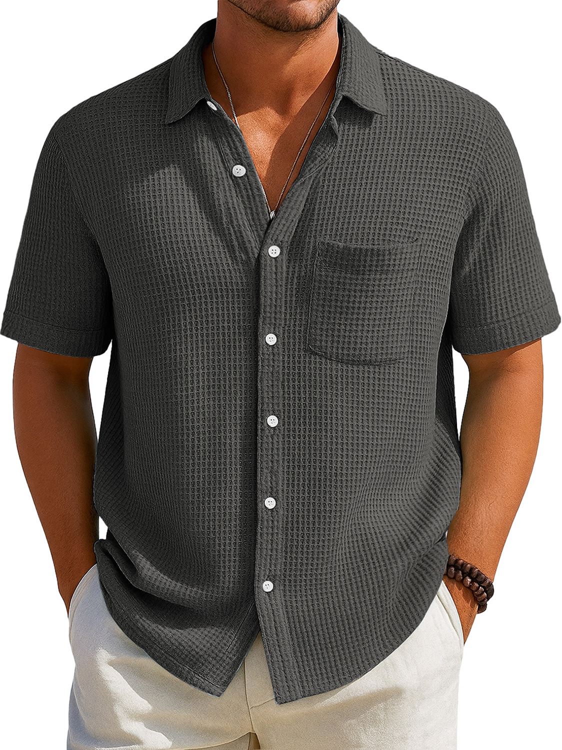 Herren Alltags Waffel Freizeit Tasche Revers Einfarbig Kurzarm Hemd