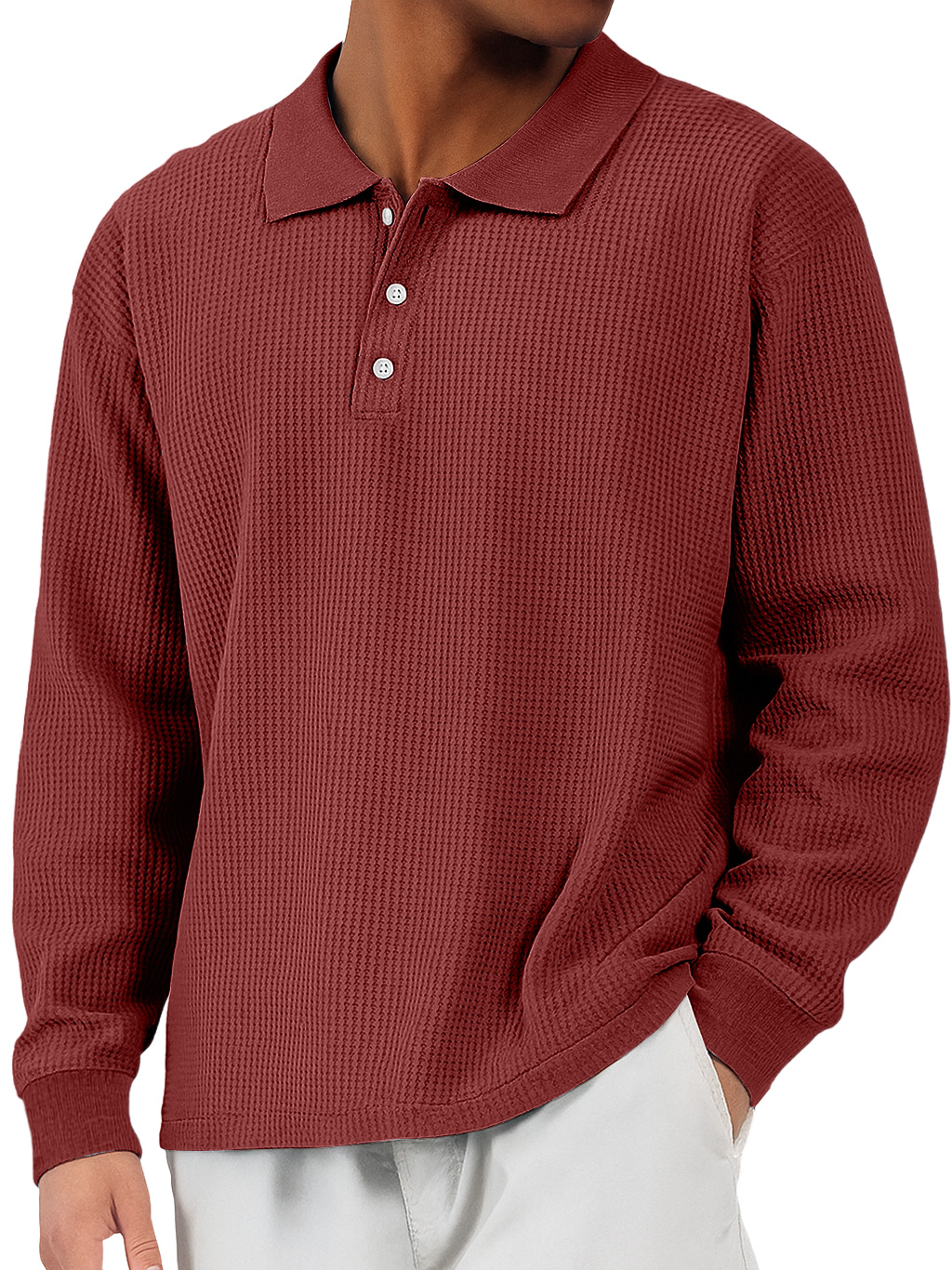Herren Alltags Waffel Revers Knopf-down Lockere Freizeit Langarm Polohemd
