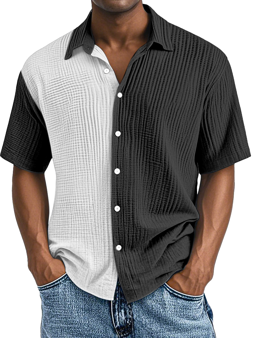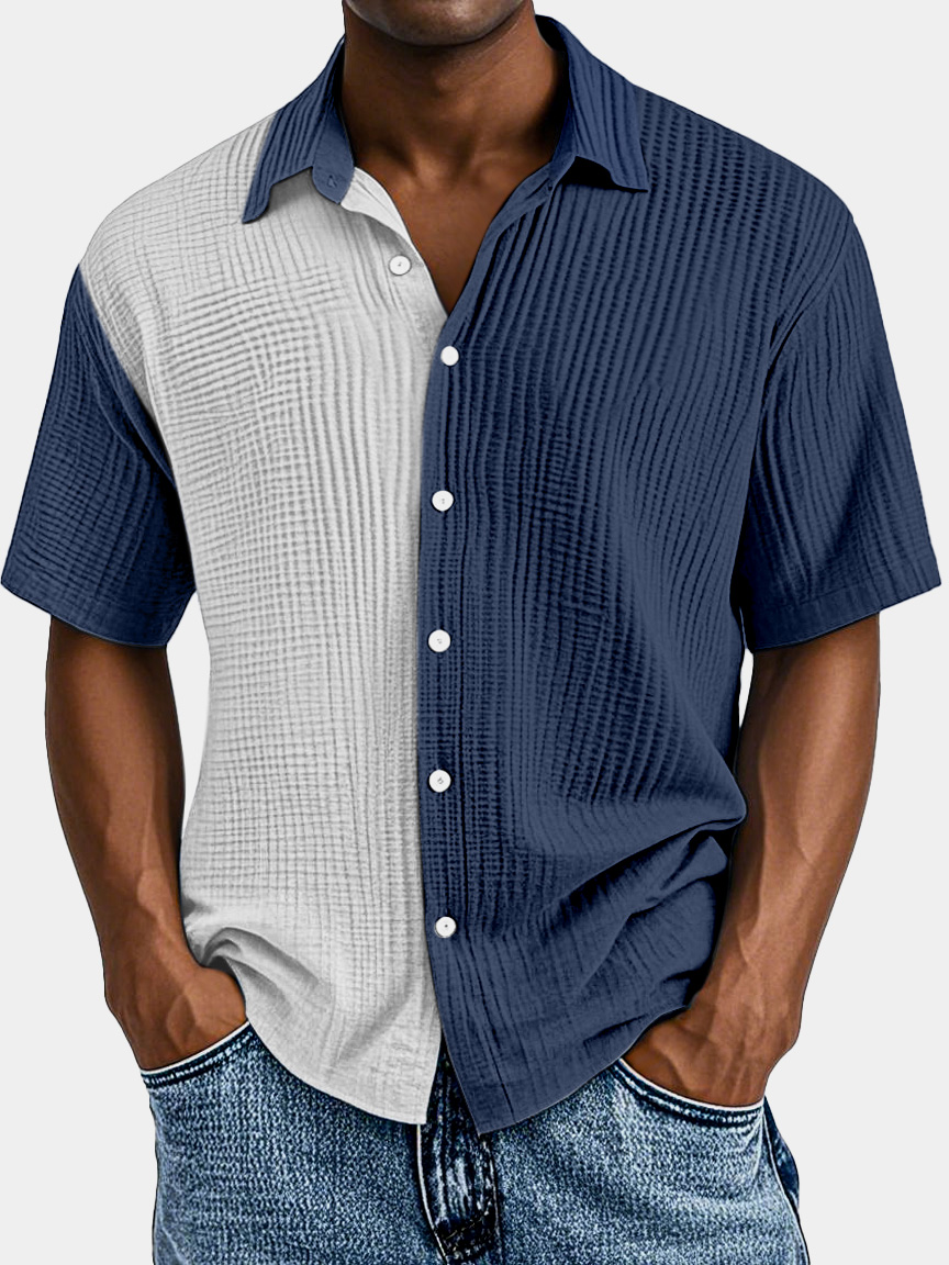 Herren Einfaches Modisches Kontrastfarben Faltenknopf Revers Kurzarmhemd